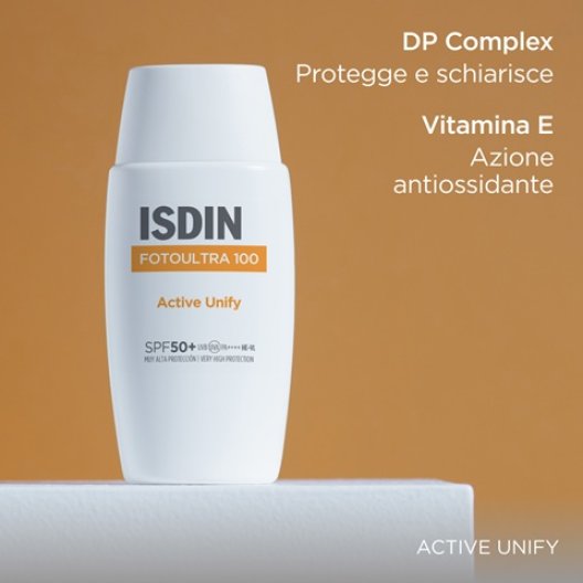 ISDIN FotoUltra 100 Active Unify SPF 50+ è un fotoprotettore viso con una protezione molto alta (SPF 50+, PA++++ e Luce Blu) e una specifica triplice azione depigmentante. È formulato per correggere e schiarire le macchie solari (come il melasma), uniformando l'incarnato e offrendo contemporaneamente una significativa azione anti-photoaging e anti-inquinamento.