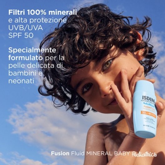 ISDIN Fotoprotector Pediatrics Fusion Fluid Mineral Baby SPF 50+ è il fotoprotettore fluido viso e corpo con filtri 100% minerali, appositamente formulato per la pelle delicata e sensibile di bambini e neonati. Offre un'alta protezione UVB/UVA (SPF 50+) e la sua formula Fusion Fluid garantisce un rapido assorbimento, pur essendo altamente resistente all'acqua.