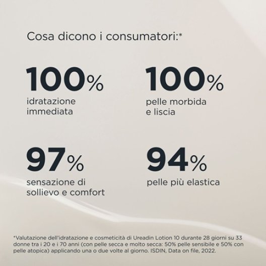 ISDIN Ureadin Lotion 10 è la lozione corpo idratante con 10% di Urea ISDIN®, ideale per la cura quotidiana e la protezione della pelle secca. Offre un'idratazione immediata e prolungata che aumenta significativamente nel tempo (fino al 94% di idratazione in più dopo 7 giorni), alleviando la sensazione di pelle che tira e donando flessibilità. La sua texture leggera e non grassa, a rapido assorbimento, la rende perfetta per l'uso su tutto il corpo.
