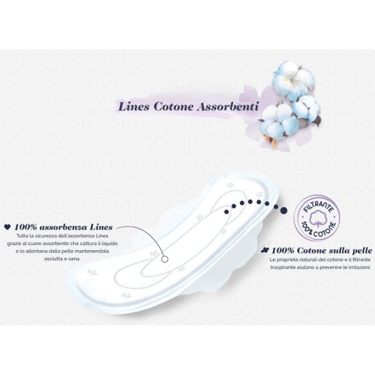La gamma Lines Cotone Bio presenta assorbenti ultra con ali e salvaslip realizzati con vero cotone biologico nel filtrante. Questa fibra naturale è compatibile con il pH fisiologico della pelle, offrendo un comfort ottimale e riducendo il rischio di irritazioni. Ogni prodotto della linea garantisce il 100% di cotone a contatto con la pelle, combinando la naturalezza del materiale con la sicurezza dell'assorbenza Lines.