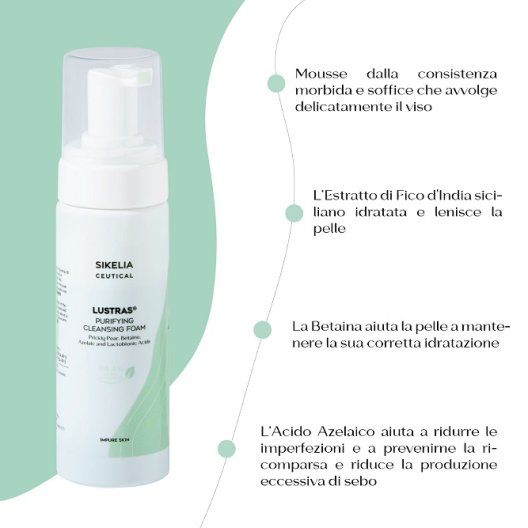 La Purifying Cleansing Foam della linea Lustras è una mousse detergente che combina attivi purificanti, seboregolatori e lenitivi per una pulizia profonda e delicata delle pelli miste e grasse. Ideale per l'uso quotidiano, la sua formula bilanciata con acido azelaico, estratto di fico d'india, betaina e acido lattobionico, assicura freschezza e comfort ad ogni applicazione, senza alterare l'equilibrio naturale della pelle.