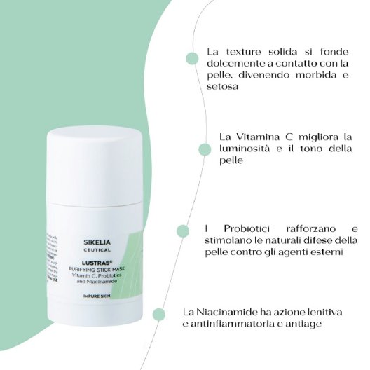 La Purifying Stick Mask della linea Lustras è una maschera purificante ideale per le pelli impure, presentata in un pratico formato stick. La sua formula ricca di argilla, vitamina C e niacinamide è perfetta per eliminare le impurità e donare alla pelle un aspetto sano e luminoso. Grazie al suo design innovativo, l’applicazione è rapida, precisa e piacevole.