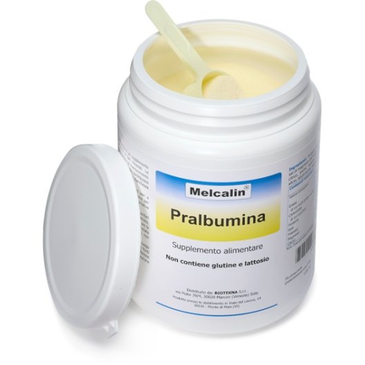 Melcalin Pralbumina e' un integratore alimentare in polvere ad alto contenuto proteico (8,7 g per dose, pari al 46% del prodotto in 100g) e minerale. La sua base e' costituita da Proteine dell'Uovo, considerate una delle fonti proteiche con il piu' alto valore biologico. Le proteine sono fondamentali per la crescita e il mantenimento della massa muscolare. La formula e' inoltre arricchita con Potassio, Magnesio e Calcio in forma di citrati, i quali contribuiscono rispettivamente alla funzione muscolare e nervosa (Potassio) e alla riduzione di stanchezza e affaticamento (Magnesio). Il prodotto e' garantito Senza Glutine e Senza Lattosio, rendendolo altamente digeribile.