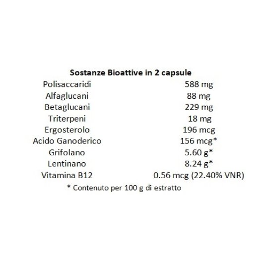 Formato: 70 capsule da 620 mg di estratto biologico di Ganoderma lucidum, Grifola frondosa e Lentinula edodes. Capsule vegetali sigillate con fascia antiossidante naturale.