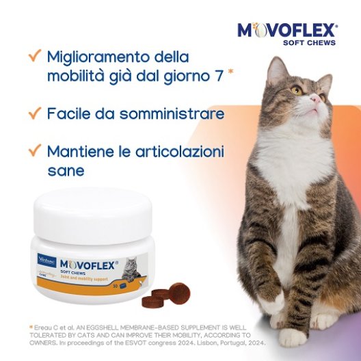 Le articolazioni sane sono essenziali per il benessere e la mobilità dei gatti, indipendentemente dall’età o dal livello di attività. Movoflex® Soft Chews per Gatti è un mangime complementare innovativo, formulato per sostenere la salute delle articolazioni dei gatti di ogni età, mantenendoli attivi, flessibili e felici.