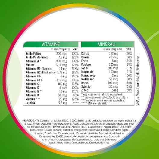 | Acido folico Acido pantotenico Vitamina A* (25% come Beta-carotene) Biotina Vitamina B1 Vitamina B2 Vitamina B6 Vitamina B12 Vitamina C Vitamina D Vitamina E** Vitamina K Niacina*** Calcio Cromo Ferro Fosforo Iodio Magnesio Manganese Molibdeno Rame Selenio Zinco |