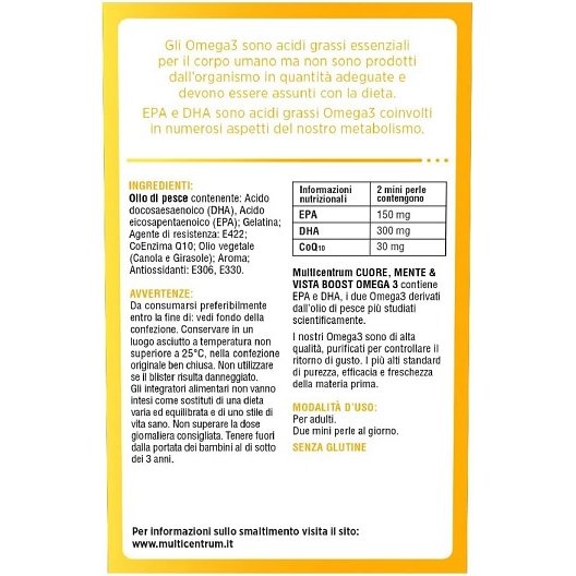- Assunzione Prolungata: Multicentrum Cuore, Mente e Vista Boost Omega 3 può essere assunto anche per periodi prolungati.