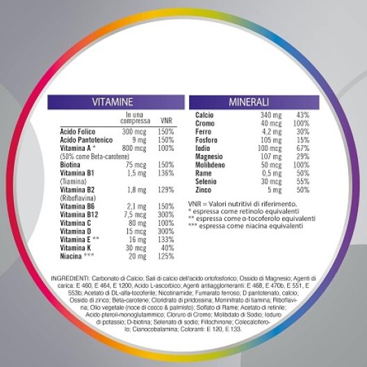 Carbonato di calcio, sali di calcio dell'acido ortofosforico, ossido di magnesio; agenti di carica: E460, E464, E1200; acido L-ascorbico; agenti antiagglomeranti: E468, E551, E553b; acetato di DL-alfa-tocoferile, nicotinamide, fumarato ferroso, calcio D-pantotenato, solfato di manganese, ossido di zinco; emulsionante: E470b; beta-carotene, cloridrato di piridossina, mononitrato di tiamina, riboflavina, gelatina, solfato di rame, olio vegetale (noce di cocco e palmisto), acetato di retinile, acido pteroil-monoglutammico, cloruro di cromo, molibdato di sodio, fillochinone; antiossidante: E321; colecalciferolo, cianocobalamina; coloranti: E171, E120, E132.