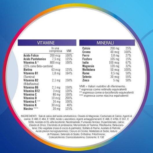 Sali di calcio dell'acido ortofosforico; Ossido di magnesio; Carbonato di calcio; Agenti di carica: E 460, E 464, E 1200; Acido L-ascorbico; Acetato di DL-alfa-tocoferile; Agenti antiagglomeranti: E 468, E 551, E 553b; Nicotinamide; Fumarato ferroso; Calcio D-pantotenato; Ossido di zinco; Solfato di manganese; Emulsionante: E 470b; Gelatina; Cloridrato di piridossina; Mononitrato di tiamina; Riboflavina; Beta-carotene; Olio vegetale (noce di cocco & palmisto); Solfato di rame; Acetato di retinile; Acido pteroil-monoglutammico; Cloruro di cromo; Molibdato di sodio; loduro di potassio; Selenato di sodio; D-biotina; Antiossidante: E 321; Fillochinone; Colecalciferolo; Cianocobalamina; Coloranti: E 171, E 132.