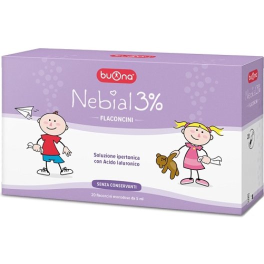 Nebial 3% flaconcini è una soluzione salina ipertonica al 3% con aggiunta di acido ialuronico pronta all'uso.