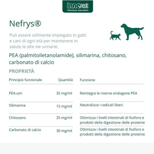 Nefrys è l'alimento complementare in formulazione liquida, ideale per promuovere il benessere delle alte vie urinarie e renali in cani e gatti di tutte le età. Data la vulnerabilità del sistema urinario e l'alta incidenza della malattia renale cronica nei gatti, un supporto nutrizionale mirato è fondamentale. Nefrys agisce con una formula avanzata che combina PEA ultra-micronizzata (PEA-um), per reintegrare le riserve endogene e mantenere l'equilibrio fisiologico renale, con potenti antiossidanti come la Silimarina (Cardo Mariano). Inoltre, grazie a Chitosano e Carbonato di Calcio, contribuisce a bilanciare i prodotti di scarto intestinali, alleggerendo il carico sui reni.