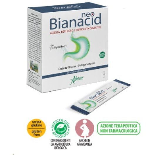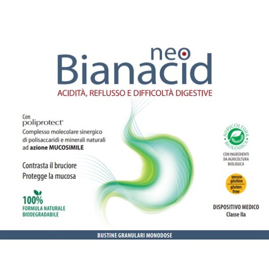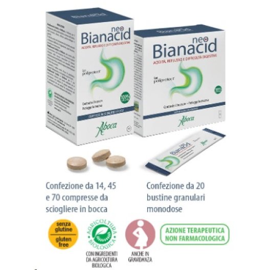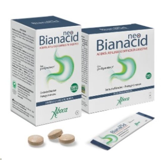 Indicazioni: NeoBianacid è indicato per il trattamento delle problematiche connesse all'acidità, come bruciore, dolore, reflusso gastroesofageo, gastrite, e nei sintomi associati a dispepsia (difficoltà di digestione) come bruciore, pesantezza e meteorismo.