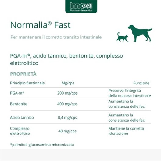 Normalia Fast è l'alimento complementare d'emergenza, specificamente formulato per la riduzione dei disturbi acuti dell'assorbimento intestinale in cani e gatti, come la classica diarrea acuta da indiscrezione alimentare. Agisce rapidamente per ripristinare la funzione intestinale durante le crisi e nei successivi periodi di convalescenza. La sua formula potente combina la Palmitoil-Glucosamina micronizzata (PGA-m), che protegge il rivestimento intestinale, con una sinergia di attivi astringenti e adsorbenti che bloccano rapidamente la diarrea. Infine, il Complesso Elettrolitico aiuta a ripristinare l'equilibrio idro-salino compromesso.