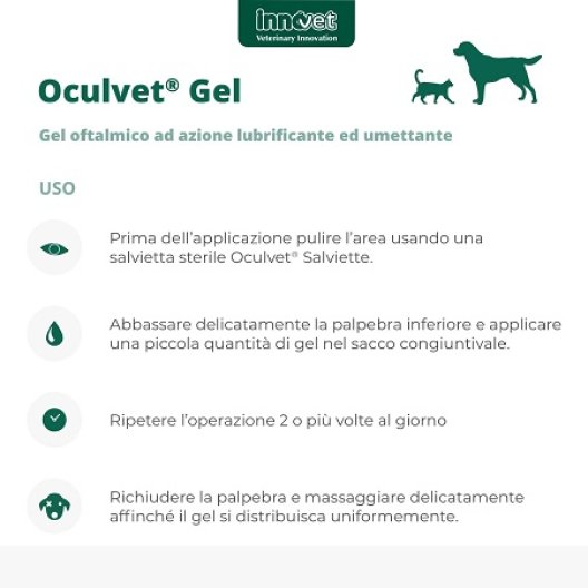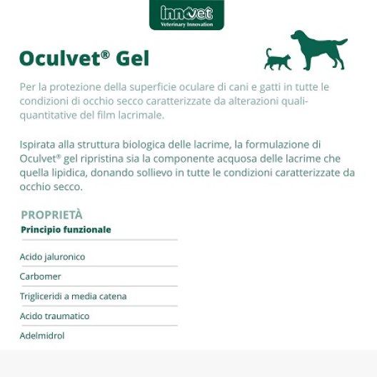 Oculvet Gel è un gel oftalmico formulato per cani e gatti, progettato per fornire un'azione lubrificante ed umettante per la protezione della superficie oculare in condizioni di occhio secco.
