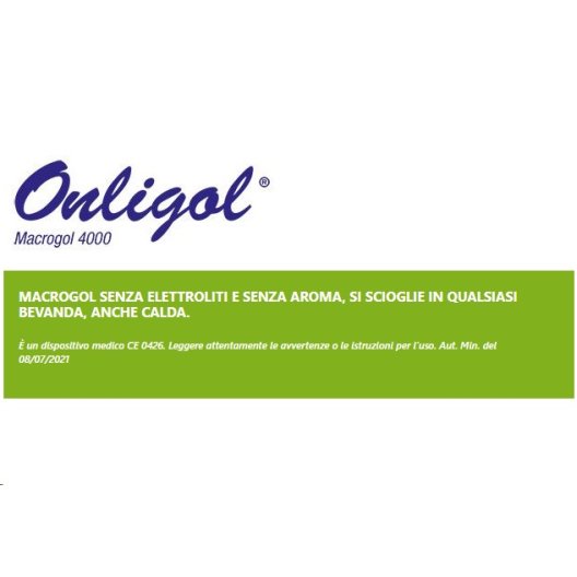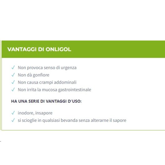Proprietà: Onligol agisce come lassativo osmotico, migliorando l'idratazione delle feci e facilitando il loro passaggio attraverso l'intestino. Il macrogol aumenta il volume delle feci e rende più morbida la consistenza.