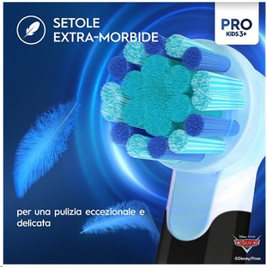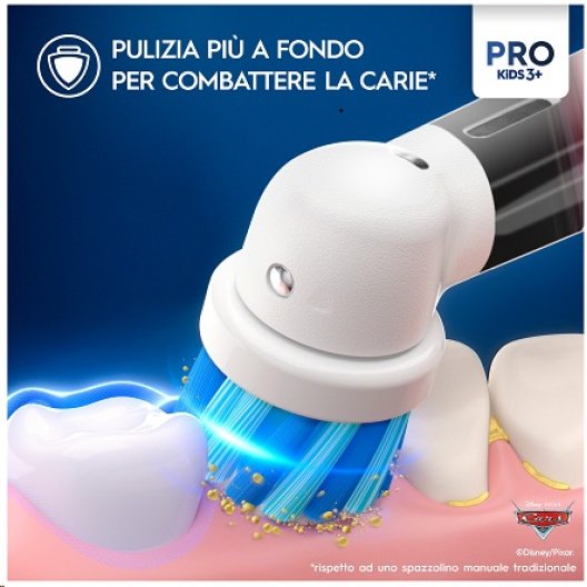 L'Oral-B Kids 3+ Spazzolino Elettrico Carsè progettato pensando alla salute dentale dei bambini, con un design ideato dai dentisti per essere delicato su denti e gengive piccoli e delicati, ma al tempo stesso efficace nella prevenzione delle carie.