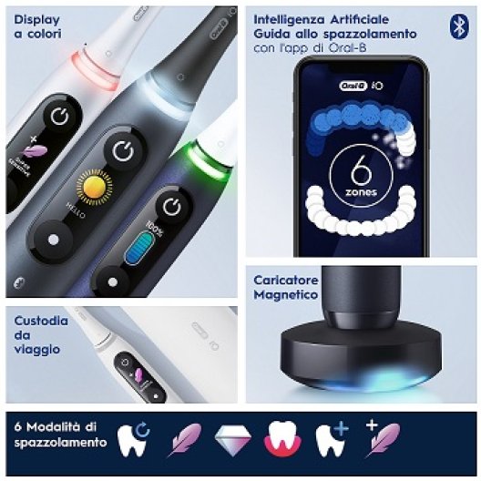Scopri la pulizia eccezionale grazie alla tecnologia magnetica rivoluzionaria di iO. L'interattivo display a colori di iO Series 8 fornisce informazioni cruciali e consente la scelta tra 6 modalità di spazzolamento: