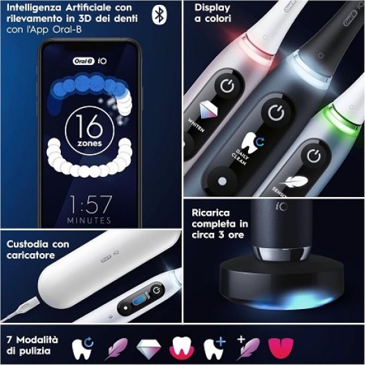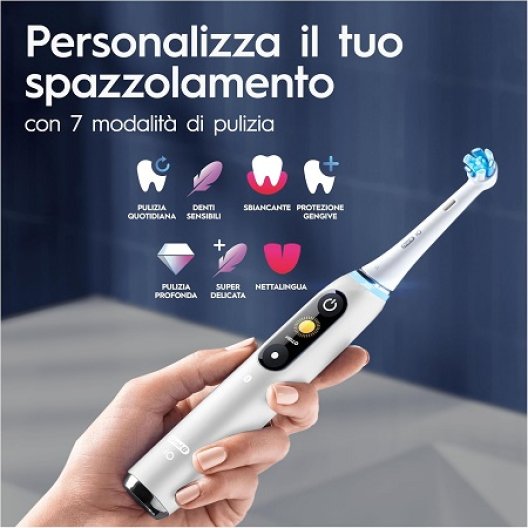 Scopri la massima pulizia grazie alla rivoluzionaria tecnologia magnetica iO. Il display interattivo a colori di iO Series 9 ti fornisce informazioni chiave e ti offre la scelta tra 7 modalità di spazzolamento: