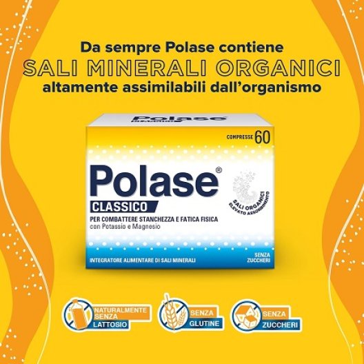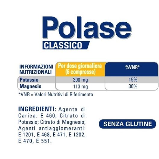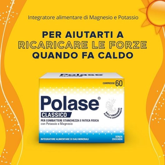 Le compresse senza zucchero di Polase sono un integratore alimentare storico formulato per fornire potassio e magnesio, aiutando a contrastare stanchezza e fatica fisica dovute al caldo. Polase contiene sali organici altamente assimilabili dall'organismo ed è senza glutine. È consigliato in situazioni di stanchezza e debolezza, derivanti da condizioni climatiche come caldo e afa, durante cambi di stagione, o quando si avverte stanchezza al risveglio o durante regimi alimentari ricchi di fibre che comportano un minore assorbimento di sali minerali.