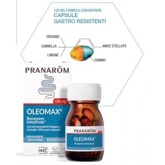 Pranarom Oleomax è un integratore alimentare con una miscela esclusiva di oli essenziali di Origano e Cannella, con attività antinfettiva combinata con oli essenziali di Cumino, Anice stellato e Limone, che favoriscono la funzione digestiva e la regolare motilità gaastrointestinale.