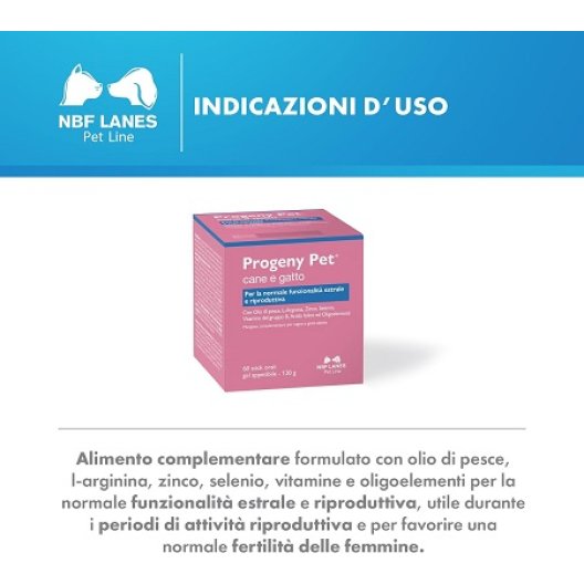 Progeny Pet di N.B.F. Lanes è il mangime complementare specificamente formulato per supportare la normale funzionalità estrale e riproduttiva delle cagne e gatte. Questo integratore, presentato in pratiche bustine, è un alleato prezioso per tutti i proprietari che desiderano favorire un ciclo riproduttivo sano e aumentare le possibilità di successo nell'allevamento. Grazie alla sua miscela bilanciata di nutrienti chiave, Progeny Pet agisce in modo completo per il benessere riproduttivo della tua femmina.