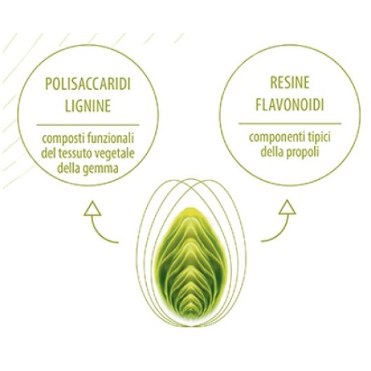 Sostanze funzionali: Propolgemma complesso molecolare di resine, polisaccaridi e lignine (ottenuto da gemme di pioppo nero, Popolus nigra L.) in estratto liofilizzato multifrazione, titolato in Flavonoidi totali = 15% e Polisaccaridi (con peso molecolare maggiore di 20.000 Da) = 4%. Contiene inoltre: Glicerina vegetale, Limone, olio essenziale.