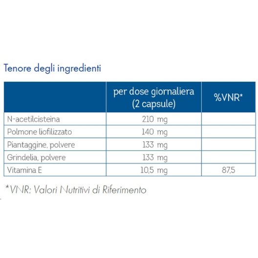N-acetilcisteina, Polmone di suino liofilizzato Neorland®, Piantaggine (Plantago lanceolata L.) foglie polvere, Grindelia (Grindelia robusta Nutt.) parti aeree fiorite polvere, agenti antiagglomeranti: sale di magnesio degli acidi grassi, biossido di silicio; correttore di acidità: calcio fosfato dibasico; Vitamina E (d-alfa-tocoferolo); (per la capsula) gelatina da tapioca naturalmente fermentata in pullulan.