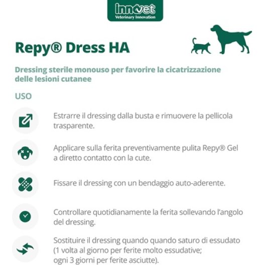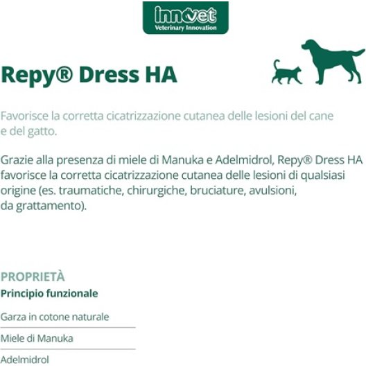 Repy Dress HA è un dressing sterile monouso avanzato, specificamente formulato per favorire la corretta cicatrizzazione di lesioni cutanee di qualsiasi origine in cani e gatti (traumi, chirurgia, bruciature, avulsioni, lesioni da grattamento). Ogni garza è realizzata in puro cotone 100% ed è imbevuta di una soluzione che unisce l'efficacia del Miele di Manuka di grado medico e dell'Adelmidrol. Questa combinazione crea un ambiente ottimale per la guarigione, mantenendo la giusta umidità, controllando la microflora superficiale e riducendo l'infiammazione e il rossore.