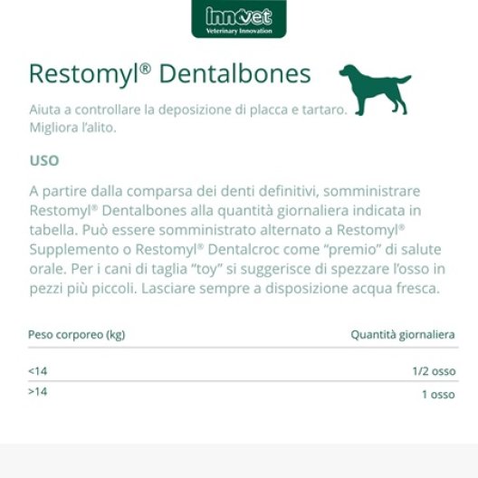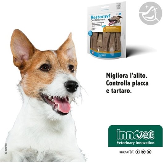 Restomyl Dentalbones è l'alimento complementare sviluppato per la pulizia quotidiana dei denti del tuo cane. Questi ossi masticabili uniscono l'efficacia dell'azione meccanica, tipica della masticazione, a una formula specifica che agisce sulla salute orale. Assunti regolarmente, i Dentalbones prevengono la formazione e l'adesione della placca sulla superficie dentaria, rallentando di conseguenza il deposito del tartaro. Il risultato è un miglioramento tangibile dell'alito e il mantenimento di una bocca più sana e pulita. Perfetti da somministrare come "premio" di salute orale, sono un modo semplice e gradito per prenderti cura dell'igiene del tuo amico a quattro zampe.