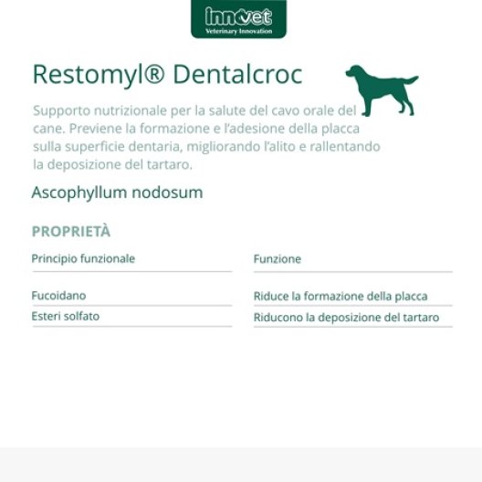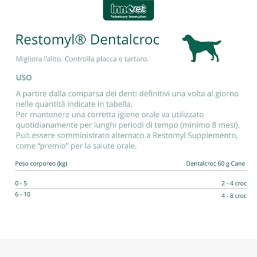 Restomyl Dentalcroc è un alimento complementare rivoluzionario, sviluppato come supporto nutrizionale sistemico per la salute del cavo orale dei cani. A differenza dei normali snack dentali, Restomyl Dentalcroc agisce per via sistemica: una volta assorbito, il principio attivo raggiunge le ghiandole salivari attraverso la circolazione e si concentra nella saliva. L'ingrediente chiave, l'Alga Bruna (Ascophyllum nodosum), il cui uso è brevettato e clinicamente dimostrato, impedisce la crescita della componente batterica della placca e riduce la deposizione del tartaro. Il primo segnale di efficacia è la naturale scomparsa dell'alito cattivo, senza l'uso di ingredienti che ne mascherano semplicemente l'odore.
