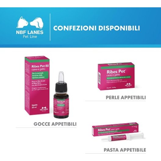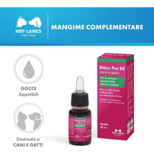 Ribes Pet 80 gocce di N.B.F. Lanes è un mangime complementare dietetico specificamente formulato per supportare la funzione della pelle nei cani e nei gatti di tutte le età, in particolare in presenza di dermatosi ed eccessiva perdita di pelo. Questo prezioso integratore offre un apporto bilanciato di acidi grassi polinsaturi Omega-6 e Omega-3, essenziali per il benessere cutaneo. Grazie all'elevata concentrazione di olio di semi di ribes nero e all'aggiunta di olio di semi di lino, Ribes Pet 80 gocce agisce come un coadiuvante naturale per mantenere la funzione barriera della pelle, promuovendo un mantello sano, forte e lucente. È l'alleato ideale per i proprietari che cercano una soluzione efficace e conveniente per i problemi dermatologici dei loro amici a quattro zampe.
