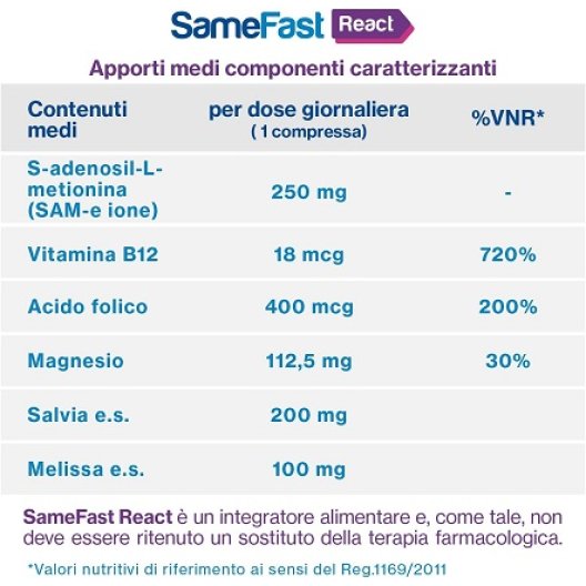 Samefast react è un integratore alimentare specifico per il mantenimento del normale tono dell’umore e per la gestione dei disturbi della menopausa, grazie a un mix di componenti specifici.