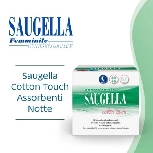 gli assorbenti notte saugella cotton touch sono arricchiti da una soluzione contenente: estratto di calendula, estratto di thymus vulgaris, acido chetoglutarico. rivestimento 100% cotone.