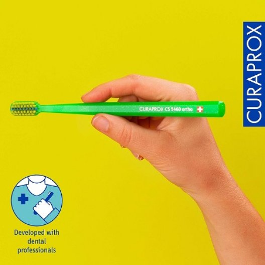 Lo spazzolino Curaprox CS 5460 Ortho è progettato per chi porta apparecchi ortodontici. Il suo taglio Bracket Groove è studiato per adattarsi alla forma dell'apparecchio, facilitando la rimozione della placca da ogni angolo. I 5460 filamenti di Curen®, ultrasottili (0,10 mm), puliscono con precisione e delicatezza, proteggendo gengive e smalto anche nelle zone più difficili da raggiungere.