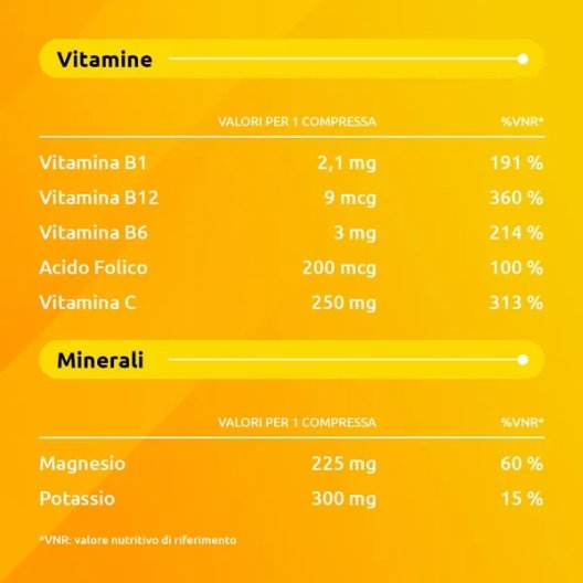 Ricarica l'Energia: La combinazione di magnesio, potassio e vitamine ti aiuta a riscoprire la tua vitalità e a ritrovare la tua energia.