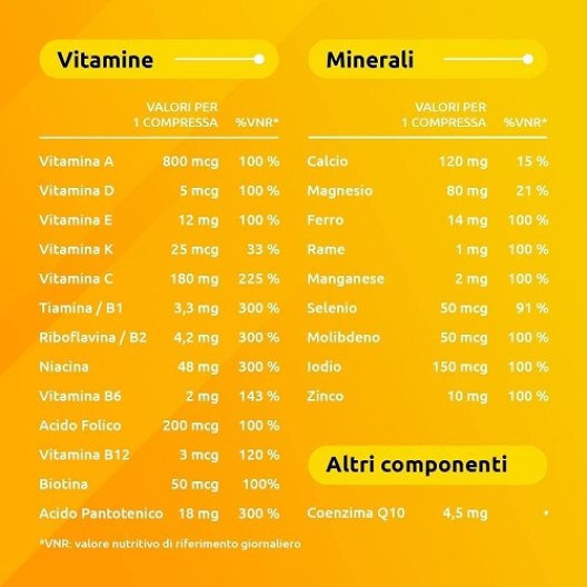 Supradyn Ricarica combina vitamine essenziali e minerali che lavorano sinergicamente per sostenere diverse funzioni dell’organismo: