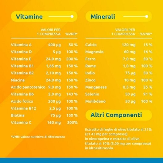 Calcio carbonato, acido ascorbico; agente di carica: cellulosa microcristallina; maltodestrine, magnesio ossido, alfa-tocoferil acetato, sodio carbossimetilcellulosa, estratto di folgie di olivo (Olea europaea L., folium), nicotinamide, ferroso fumarato, idrossipropilmetilcellulosa, polidestrosio, ossido di zinco, biossido di silicio, magnesio stearato, calcio pantotenato, potassio ioduro, talco, vitamina A palmitato, estratto di olivo (Olea europaea L., fructus); colorante: titanio diossido; manganese solfato, piridossina idrocloridrato, rame solfato, riboflavina, tiamina mononitrato, trigliceridi a media catena; colorante: ossidi di ferro; acido pteroilmonoglutammico, sodio molibdato, selenato di sodio, biotina, colecalciferolo, cianocobalamina.