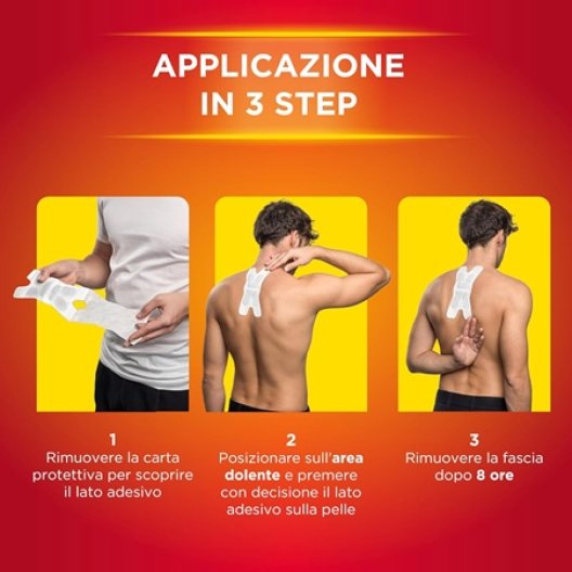 Posizionamento: Posizionare la fascia direttamente sull'area dolente e premere con decisione il lato adesivo sulla pelle. Attenzione: consultare le avvertenze per le aree dove non applicare la fascia.