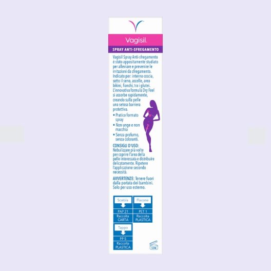 - Sensazione setosa e asciutta: grazie alla formula avanzata "Dry Feel", Vagisil Spray Anti-Sfregamento crea una barriera protettiva tra la pelle e il tessuto o altre superfici di contatto, lasciando una piacevole sensazione di seta.