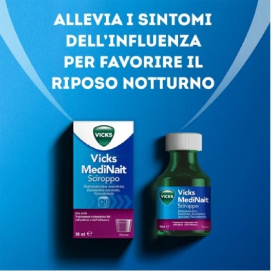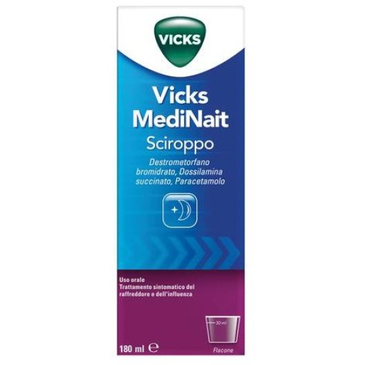 Posologia Adulti e adolescenti oltre 12 anni: La dose raccomandata è 30 ml una volta al giorno. 30 ml contengono 0,015 g di destrometorfano bromidrato, 0,0075 g di dossilamina succinato e 0,6 g di paracetamolo Non superare le dosi raccomandate. Durata di trattamento Dopo 3 giorni di impiego continuativo, in assenza di risultati apprezzabili, rivalutare il quadro clinico. Modo di somministrazione Vicks MediNait va assunto prima di coricarsi per il riposo notturno e a stomaco pieno. Servirsi del bicchiere dosatore incluso nella confezione.