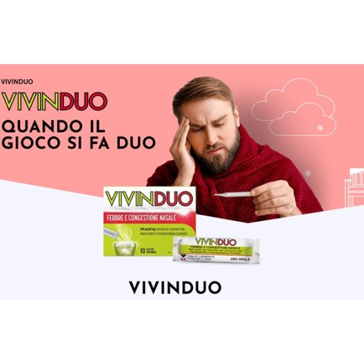 Quando i sintomi influenzali e del raffreddore colpiscono, è necessario un'azione rapida e combinata. vivinduo febbre e congestione nasale è un medicinale che unisce l'efficacia del paracetamolo contro febbre e dolori, con l'azione decongestionante della pseudoefedrina. La sua formulazione in granulato per soluzione orale (anche calda) agisce rapidamente, liberando il naso chiuso e alleviando i sintomi dolorosi, consentendoti di tornare alla tua quotidianità.