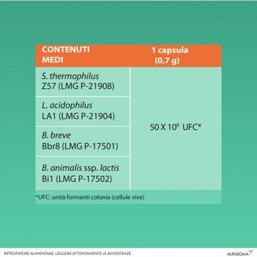 Streptococcus thermophilus Z57 (BCCM: LMG P-21908)*, Lactobacillus acidophilus LA1 (BCCM: LMG P-21904)*, Bifidobacterium breve Bbr8 (BCCM: LMG P-17501)*, Bifidobacterium animalis ssp. lactis Bi1 (BCCM: LMG P-17502)*; agente di rivestimento: idrossipropilmetilcellulosa; Agenti antiagglomeranti: biossido di silicio, sali di magnesio degli acidi grassi; colorante: titanio biossido.
