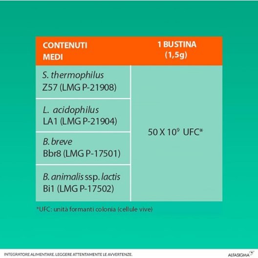 Agente di carica: sorbitolo; streptococcus thermophilus (BCCM: LMG P-21908)*, lactobacillus acidophilus (BCCM: LMG P-21904)*, bifidobacterium breve (DSM 33231)*, bifidobacterium animalis ssp. lactis (DSM 33233)*, aroma; agente antiagglomerante: biossido di silicio; edulcorante: sucralosio.
