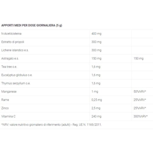 Maltodestrine, N-Acetilcisteina, PropolG™ e.s. di Propoli tit. 2% in polifenoli (HPLC), Lichene islandico (Cetraria islandica (L.) Ach., tallo) e.s. 4:1, Pureway-C® [Vitamina C (Acido L-ascorbico), Bioflavonoidi da agrumi, emulsionante: acidi grassi], Acidificante: Acido citrico; Astragalo (Astragalus membranaceus Moench, radice) e.s. tit. 16% in polisaccaridi, Correttore di acidità: Sodio bicarbonato, Gluconato di zinco, Tea tree (Melaleuca alternifolia (Maiden & Betche) Cheel), o.e.**, Eucalipto (Eucalyptus globulus Labill.) o.e.**, Timo bianco (Thymus serpyllum L.) o.e.**, Gluconato di manganese, Gluconato di rame. **= supportato su maltodestrine e amido di riso. PropolG è un marchio depositato di Giellepì Spa Pureway-C è un marchio registrato di Innovation Laboratories Inc.