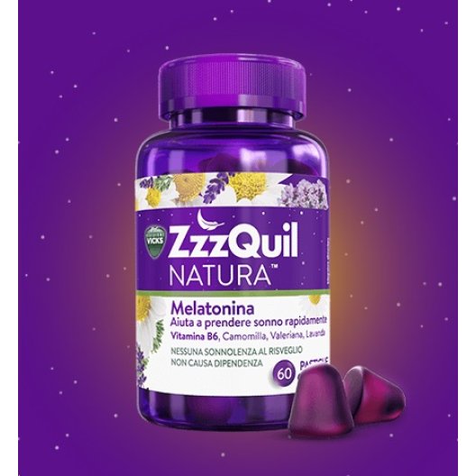 Le pastiglie gommose ZzzQuil Natura sono un innovativo integratore per dormire che offre una soluzione naturale per favorire il sonno. Contengono 1 mg di melatonina, un ormone naturale che regola il ciclo del sonno, e una miscela esclusiva di camomilla, lavanda e valeriana. Questa formulazione unica promuove un sonno rapido e ristoratore, senza causare sonnolenza durante il giorno.