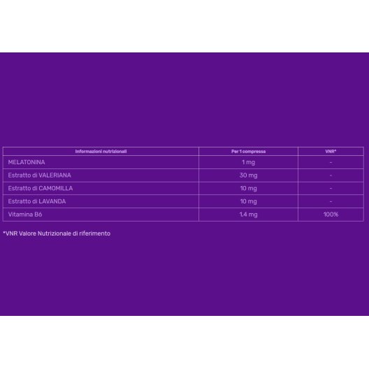 Sciroppo di glucosio, saccarosio, acqua, gelatina (suino); regolatore di acidità: acido citrico; valeriana (Valeriana officinalis L.) radice estratto; colorante: concentrato di bacche di sambuco, lavanda (Lavandula angustifolia Miller) fiori estratto, camomilla (Matricaria chamomilla L.) fiori estratto; antiossidante: E300; piridossina cloridrato (vitamina B6); melatonina; aroma: aroma naturale; agente di rivestimento: E903.
